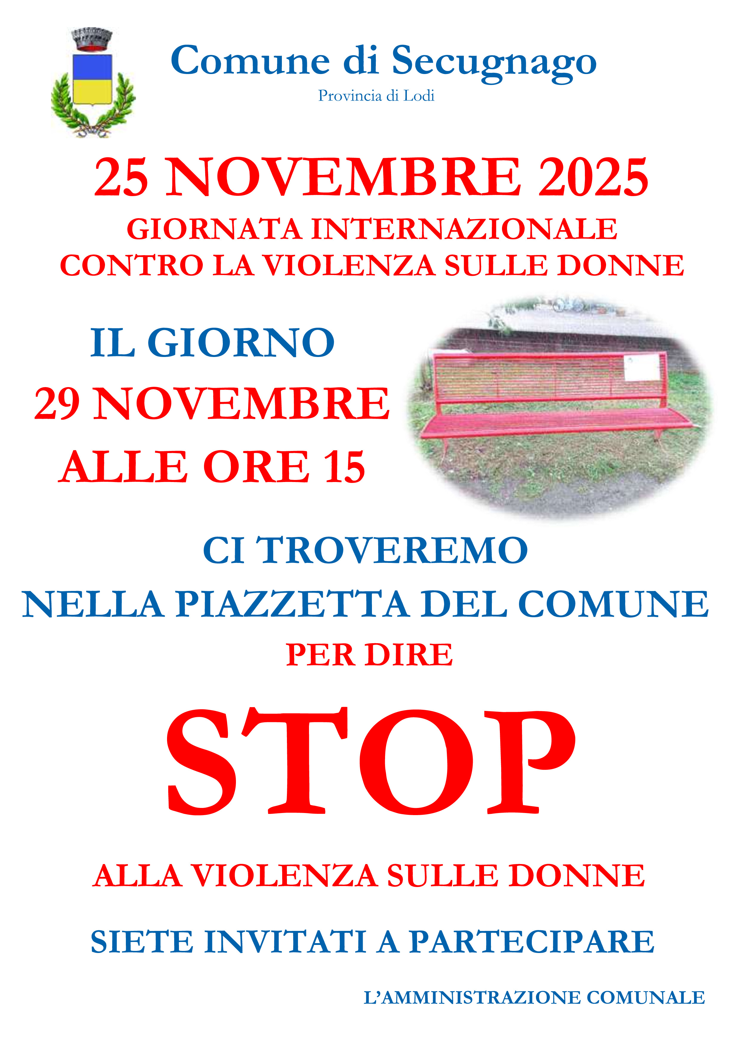 Ritrovo il 29/11/2025 ore 15:00 nella piazzetta antistante il comune per dire STOP alla violenza sulle donne.