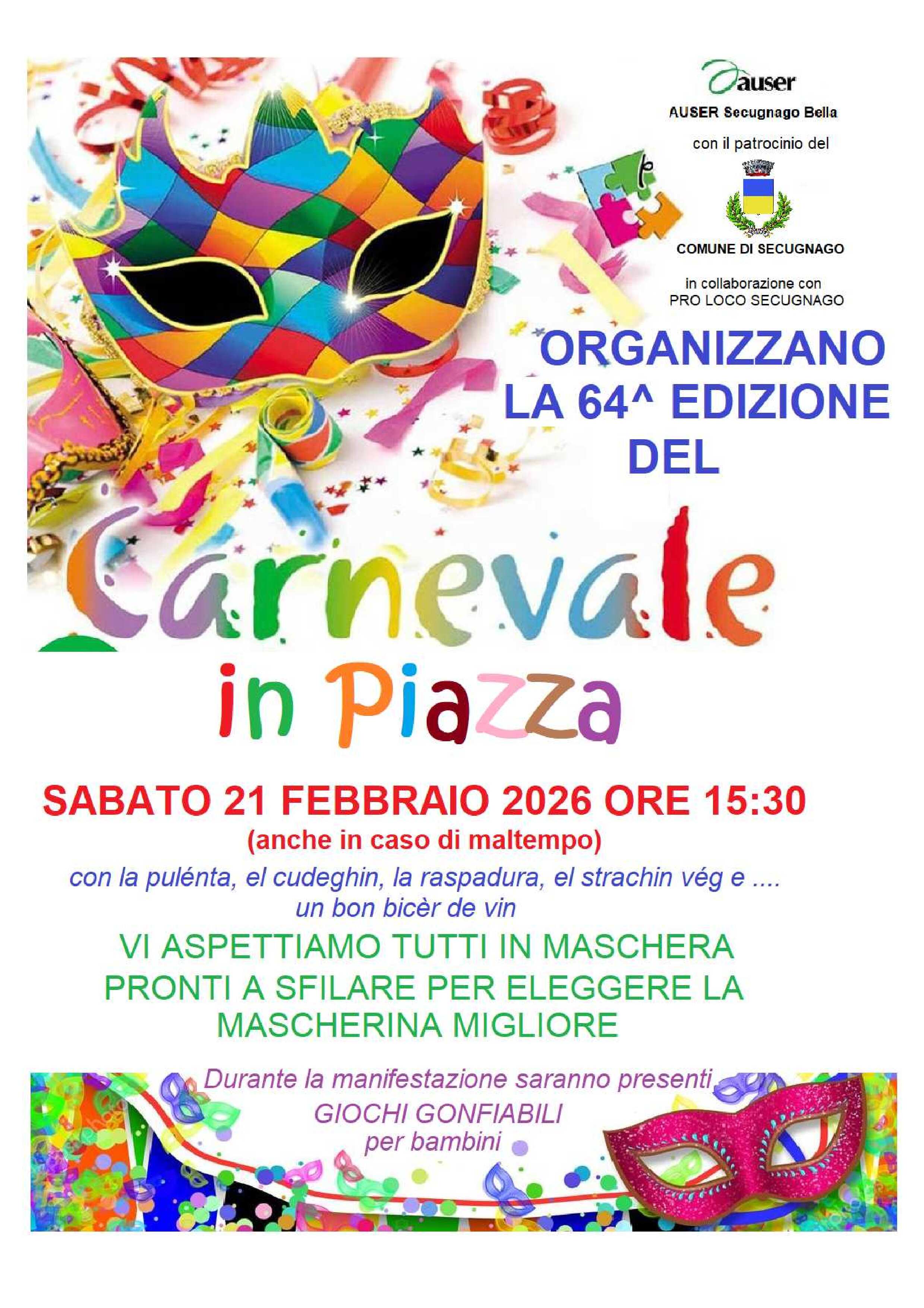 Appuntamento in piazza Matteotti a Secugnago il giorno 21 Febbraio 2026 dalle ore 15:30