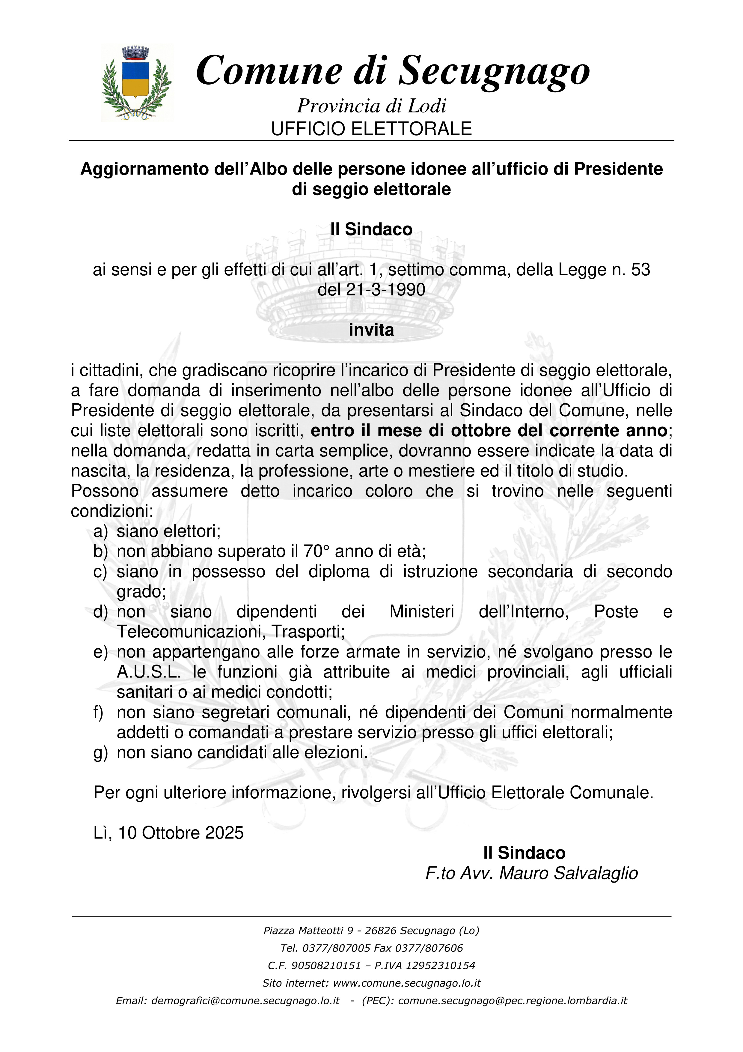 Aggiornamento dell'Albo delle persone idonee all'ufficio di Presidente di seggio elettorale
