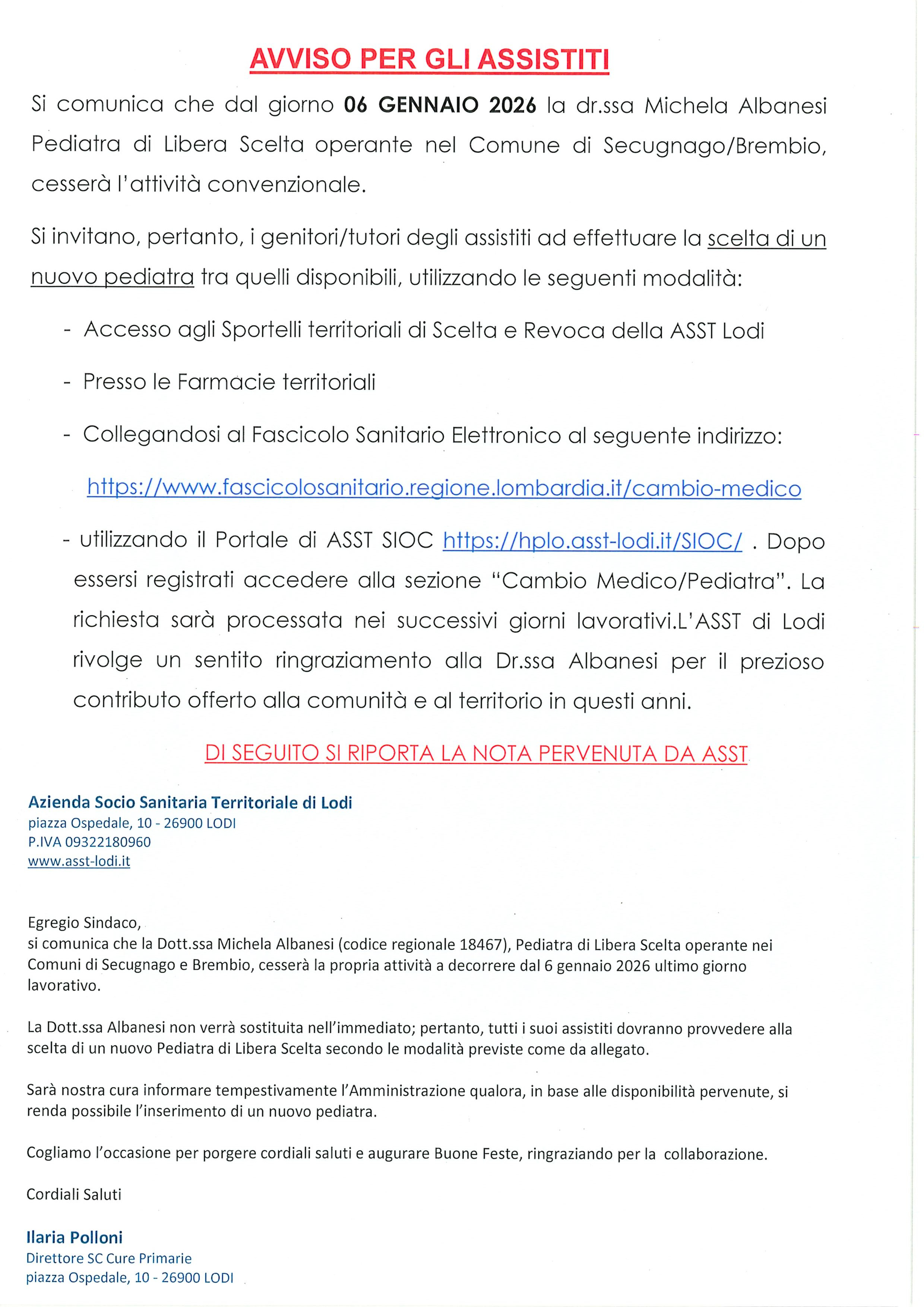 Si comunica che dal giorno 06 GENNAIO 2026 la dr.ssa Michela Albanesi, Pediatra di Libera Scelta, operante nel Comune di Secugnago/Brembio, cesserà l'attività convenzionale.