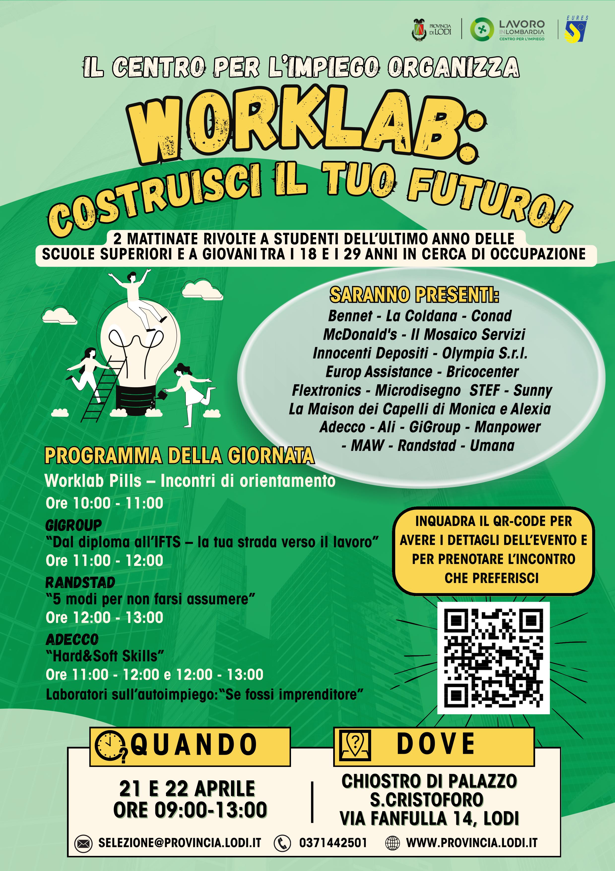 Volantino relativo all’iniziativa “WorkLab – Costruisci il tuo futuro”, in programma nelle giornate del 21 e 22 aprile.